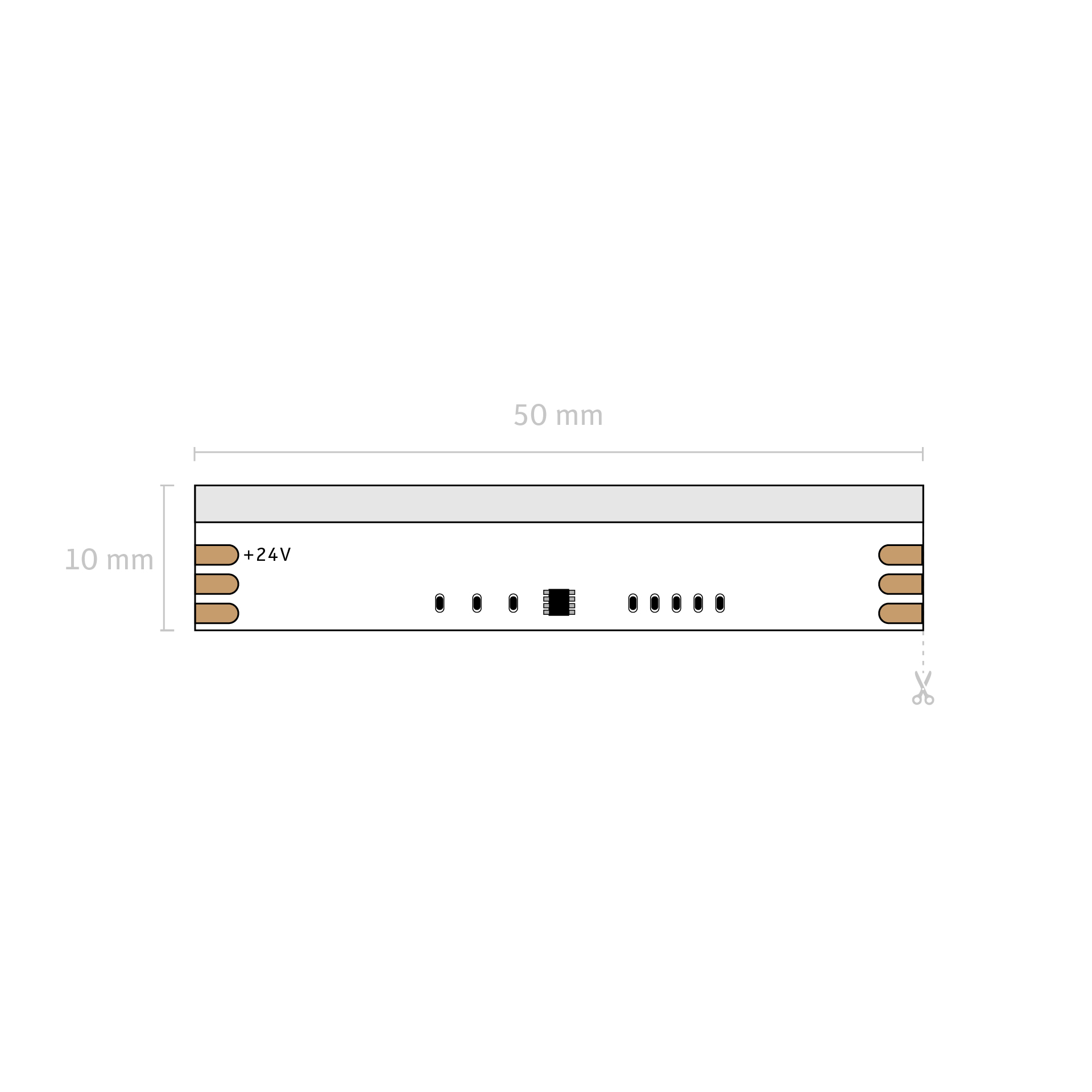 Operating on 24V, the strip comes in 5m reels and can run up to 10m powered from one end. Cut points every 50mm give you precise flexibility during installation. Measuring 10mm wide (10.5mm coated) and 2mm deep (3mm coated), it fits easily into profiles and narrow recesses.