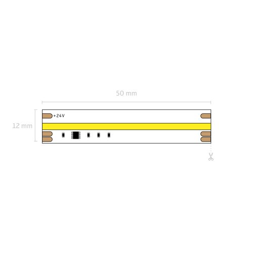 Running at 24V, each 5m reel can extend up to 10m powered from one end. Flexible cut points every 50mm allow precise adjustments for bespoke installations. Measuring 12mm wide (12.5mm coated) and 2mm deep (3mm coated), the strip is slim enough for aluminium profiles, recessed channels, or creative designs.