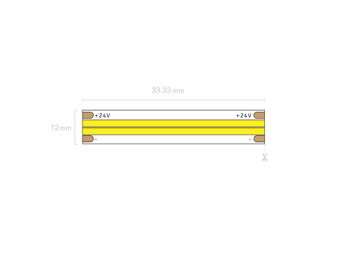 Available in 2700K, 3000K, 4000K, and 6000K, it suits both warm and neutral lighting schemes. Running on 24V allows longer installations, with up to 10m powered from one end. Cut points every 33mm enable precise installation, while the slim 12mm width fits standard profiles.