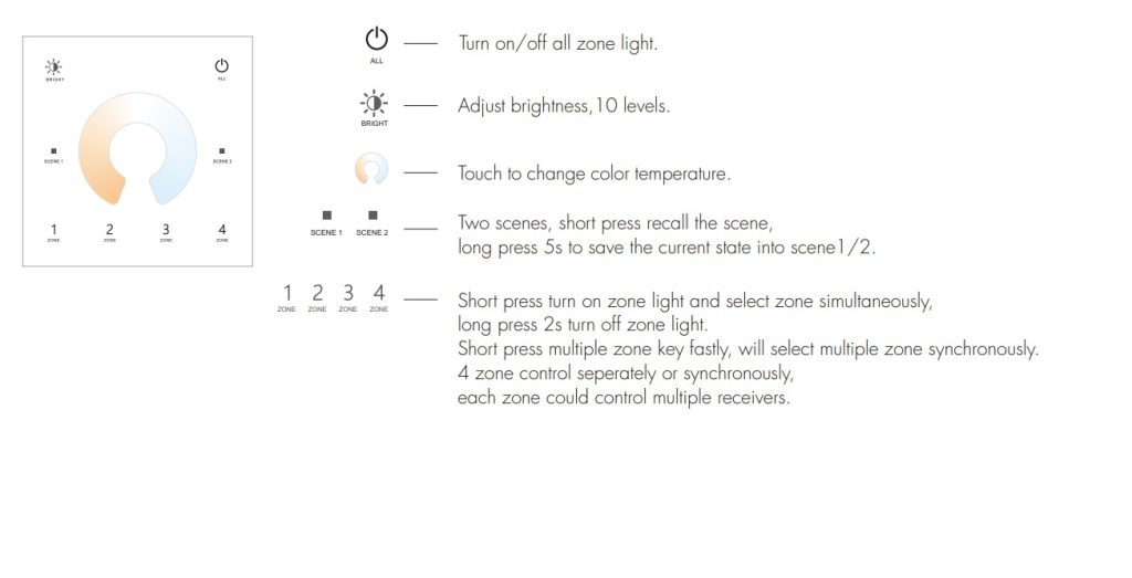 With four independent zones, you can manage multiple areas from a single, sleek wall-mounted unit. The 0–100% dimming range ensures smooth brightness adjustment, while CCT control lets you shift from warm to cool whites to suit different moods and environments.