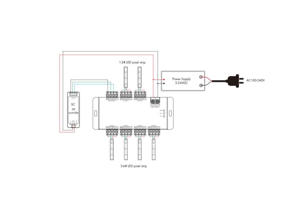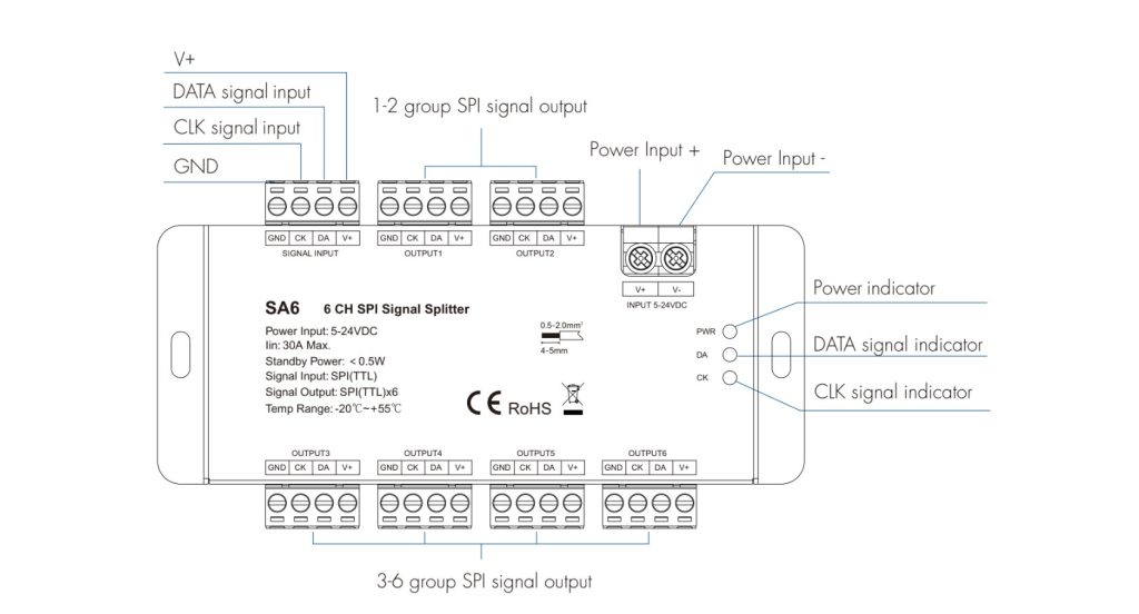 The RC-PIXEL-6 is a professional 6-way SPI signal splitter designed to expand and amplify SPI (TTL) signals for pixel LED installations. With 1 SPI input and 6 SPI outputs, it enables synchronous control of multiple SPI digital RGB or RGBW LED strips from a single controller.