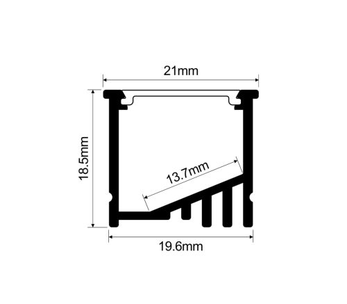 The INSTYLE LED Recessed Angle Wall Wash LED profile is a high-quality aluminium housing designed to deliver angled illumination for stylish wall wash effects. Measuring 21mm wide and 18.5mm high, it accommodates LED strip lighting up to 13.7mm wide, making it suitable for both commercial and residential installations.