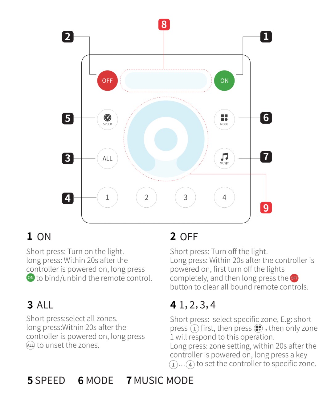 The intuitive touch rings provide smooth adjustment of brightness, color hue, and white temperature, while the zone buttons let you manage areas independently or all at once. Additional features include music mode, 1–100% dimming, and easy remote pairing/unpairing. Designed for modern interiors, the PIXEL-WALL combines style, convenience, and advanced wireless control.