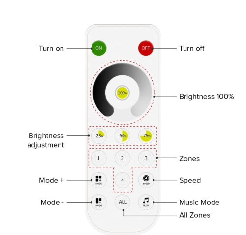 The PIXEL-RM-DIM is a modern RF touch panel remote designed for precise control of single-colour LED lighting across up to 4 zones. Its intuitive touch brightness ring allows smooth 1–100% dimming, while zone buttons provide independent or grouped control for maximum flexibility.
